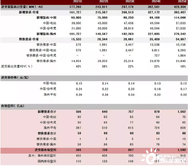 光伏逆變器需求主要來自新增裝機需求及存量替換需求兩部分,隨光伏行業需求快速增長及存量替換需求加速,我們測算2025年光伏逆變器市場空間可達1090億元。