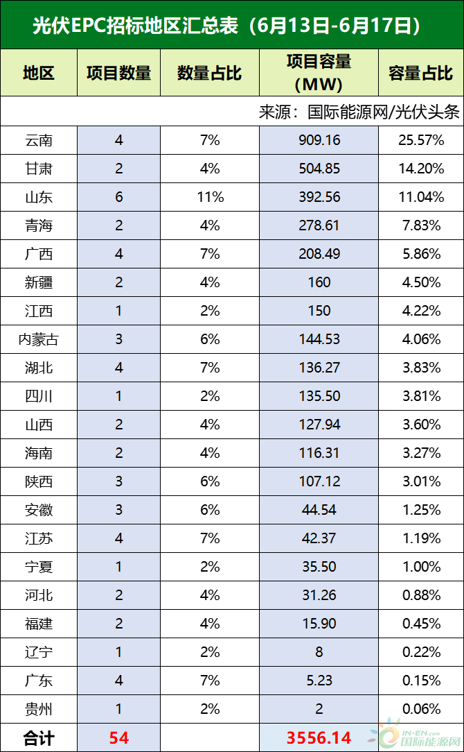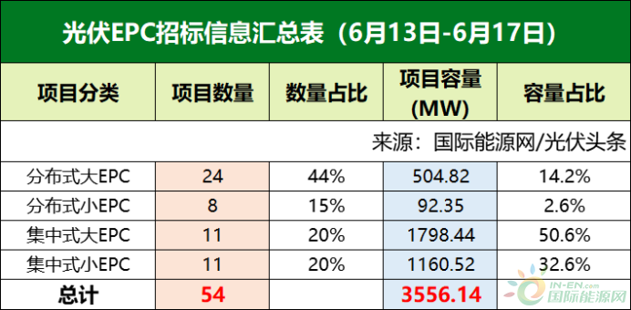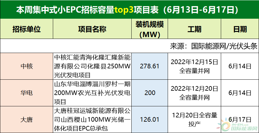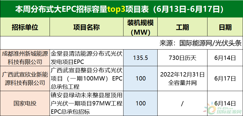 國際能源網/光伏頭條(PV-2005)對6月第3周(6月13日-6月17日)光伏EPC招/中標項目不完全統計,本周招標規模合計3556.14MW,中標規模3017.34MW,招中標規模合計6573.48MW。此外,本周多晶硅、電池片紛紛上漲,組件龍頭企業加速產業鏈垂直一體化,同樣值得關注!
