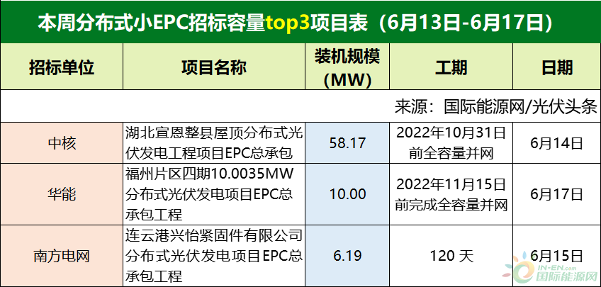 此外,本周分布式、集中式小EPC招標容量TOP3項目,具體情況如下: