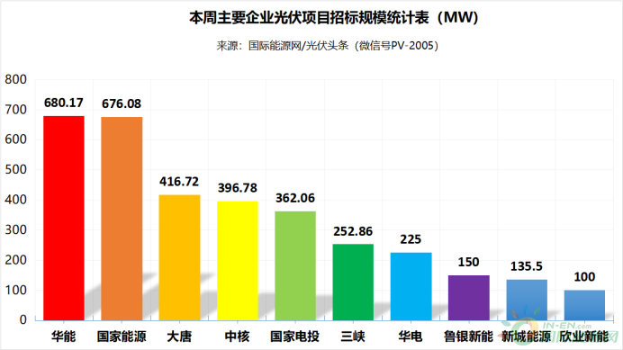 國際能源網/光伏頭條(PV-2005)統計,本周華能、國家能源、大唐等企業發布了54個光伏招標項目,裝機規模合計3556.14MW。