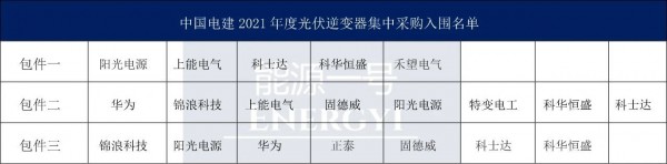 近日,中國電力建設(shè)股份有限公司(下稱“中電建”)公布了2021年度光伏逆變器集中采購項目入圍情況。入圍廠商總計有10家,分別列在不同的包件內(nèi)。它們是華為、上能電氣、陽光電源、錦浪科技、固德威、特變電工等公司。