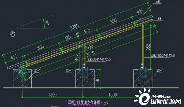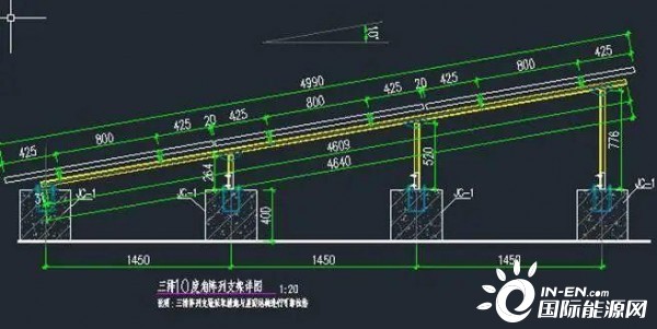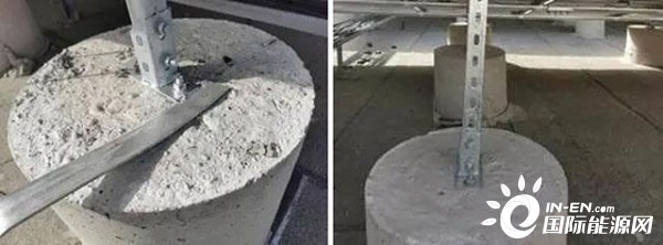 整個現場有單排10度角、雙排10或20度角、三排10度角三種安裝形式,通過抬高傾角降低組串前后排間距,方便安裝更多數量的組件。對于有坡度的屋面,還需要利用支架進行找平。