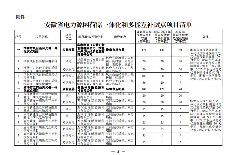 【國際能源網 訊】近日,安徽省能源局關于印發安徽省電力源網荷儲一體化和多能互補試點項目清單的通知,將淮南市鳳臺縣風光儲一體化項目等4個項目作為“一體化”試點項目,項目規模共計451萬千瓦,其中2022年下達風電光伏發電建設規模共計116萬千瓦。具體如下:
