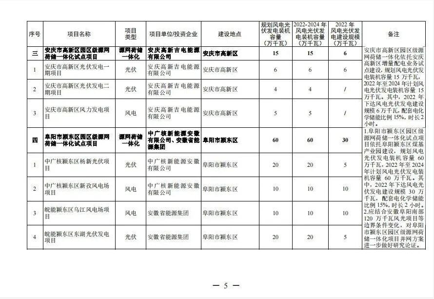 安慶市高新區園區級源網荷儲一體化試點項目依托安慶高新區增量配電業務試點建設,規劃風電光伏發電裝機容量15萬千瓦,2022年至2024年計劃風電光伏發電裝機容量15萬千瓦。其中,2022年下達風電光伏發電建設規模6萬千瓦,配套電化學儲能比例15%,時長2小時。