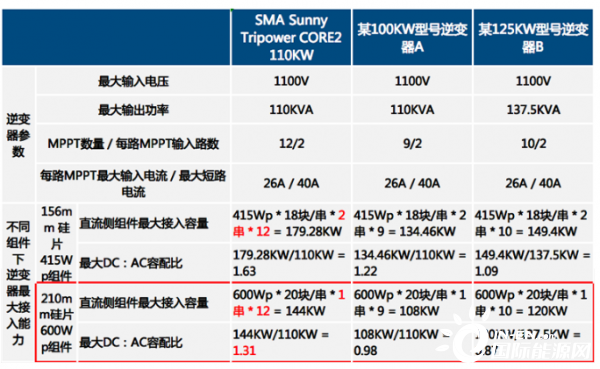 表1 不同逆變器對應大尺寸硅片組件接入能力對比圖