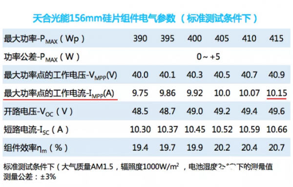 根據天合156mm硅片組件和210mm硅片組件的電氣性能參數規格表所示(標準測試條件下),隨著組件功率的提升,最大功率點處的輸出電流也隨之增大。如下圖所示,156mm硅片415Wp組件最大功率點處的輸出電流(以下簡稱Impp)是10.15A。