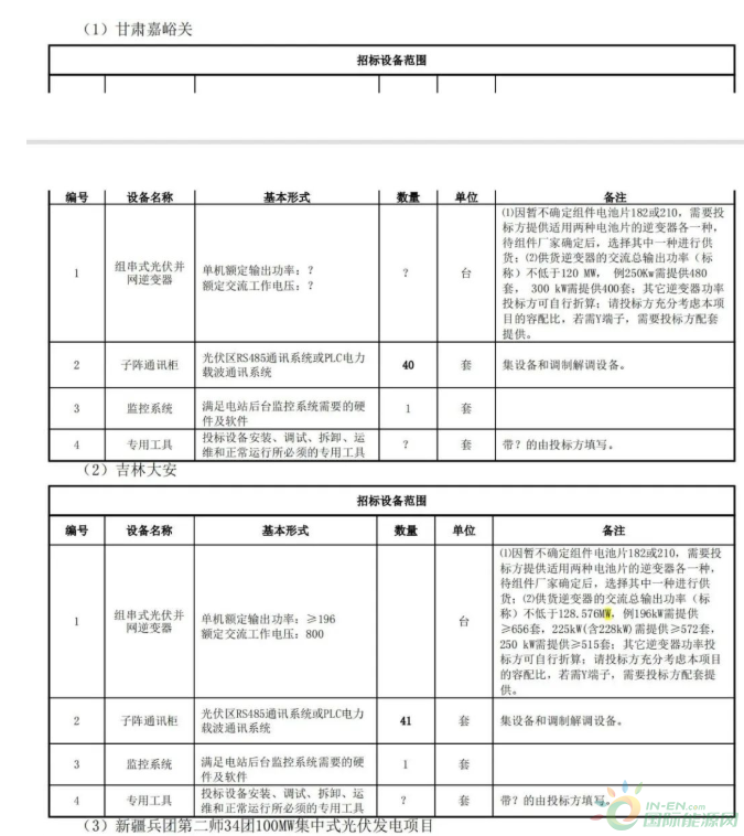 根據(jù)招標(biāo)公告,甘肅嘉峪關(guān)供貨逆變器的交流總輸出功率(標(biāo)稱(chēng))不低于120MW,吉林大安供貨逆變器的交流總輸出功率(標(biāo)稱(chēng))不低于128.576MW,新疆兵團(tuán)第二師34團(tuán)100MW集中式光伏發(fā)電項(xiàng)目供貨逆變器的交流總輸出功率(標(biāo)稱(chēng))不低于100.352MW,大姚縣石板箐二期光伏發(fā)電項(xiàng)目供貨逆變器的交流總輸出功率(標(biāo)稱(chēng))不低于200MW,合計(jì)規(guī)模548.928MW。