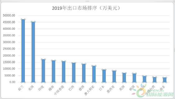 通過上表可以看出,在排名前20的逆變器企業中,出口金額排序變化不大,前三甲與2018年相同,華為、陽光、錦浪依舊領跑,而前四名的企業出口金額均已超過1億美元,頭部企業的集中趨勢明顯。從具體數字來看,華為以絕對優勢領跑整個榜單,以4.9億美元、16.9%的占比,超過第二位8.3個百分點,位于第二位的陽光電源與第三位的錦浪科技,出口金額占比相差近5個百分點。 綜合來看,前三甲的總體出口額占比有所提升,從2018年的27.68%提高到了29.35%。 從出口市場來看,荷蘭依舊是逆變器出貨量最多的目的國,其次是美國和印度。越南、巴西、德國、澳大利亞、日本、墨西哥等海外市場也進入了出口目的國前十。 排名前十的海外市場,總計出口額超過了19.99億美金,占全部出口額的近70%。 回顧過去,2019年是逆變器企業變動較大的一年,錦浪科技于2019年3月19日成功上市,成為國內首家專注組串式逆變器的上市企業。近日,錦浪科技發布了業績預告,該公司于去年第四季度的單季業績或再創新高,預計實現歸屬于上市公司股東的凈利潤為4723.03萬元~6223.03萬元之間。與上年同期相比,同比大幅增長27.6%~68.12%,再次刷新錦浪科技的單季度歷史最高業績。