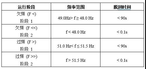 當(dāng)電網(wǎng)頻率超過光伏逆變器的正常運行范圍時,逆變器應(yīng)在規(guī)定時間內(nèi)脫網(wǎng),以保證設(shè)備的安全運行。逆變器應(yīng)具備足夠的頻率測試精度,以便于及時偵測到電網(wǎng)頻率的異常,并在電網(wǎng)頻率異常的情況下執(zhí)行保護動作。過/欠頻保護采取二級保護策略,不同過/欠頻下,光伏逆變器的脫網(wǎng)時間如下表所示: