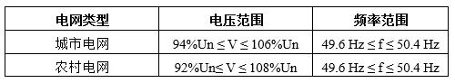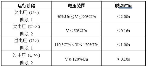 當(dāng)電網(wǎng)電壓超過光伏逆變器的正常運行范圍時,逆變器應(yīng)在規(guī)定時間內(nèi)脫網(wǎng),以保證設(shè)備的安全運行。逆變器應(yīng)具備足夠的電壓測試精度,以便于及時偵測到電網(wǎng)電壓的異常,并在電網(wǎng)電壓異常的情況下執(zhí)行保護動作。過/欠電壓保護采取二級保護策略,不同過/欠電壓下,光伏逆變器的脫網(wǎng)時間如下表所示: