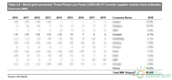 2018年固德威在全球市場取得了不俗業(yè)績,國際影響力與日俱增。據(jù)權(quán)威調(diào)研機(jī)構(gòu)IHS最新發(fā)布的光伏逆變器市場數(shù)據(jù)中顯示,固德威三相光伏逆變器出貨量激增,銷量突破2GW,全球排名名列前茅。這跟固德威近年持續(xù)不斷推出工商業(yè)系統(tǒng)解決方案,持續(xù)發(fā)力工商業(yè)分布式和大型光伏電站密切相關(guān)。