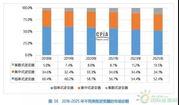 光伏逆變器按照適用場所分為集中式逆變器、集散式逆變器、組串式逆變器以及微型逆變器。集中式和組串式逆變器我相信大家都不很清楚其中的區(qū)別,今天我們主要講一講集散式光伏逆變器,集散式光伏發(fā)電解決方案是指:分散MPPT尋優(yōu),集中并網(wǎng)發(fā)電形式,通過前置多個MPPT控制優(yōu)化器,實現(xiàn)多路MPPT尋優(yōu)功能,匯流后采用集中式逆變器逆變的新型、高效光伏發(fā)電解決方案。 此方案的推出,讓電站投資商們在集中式和組串式之外,還有第三種選擇。目前,國內(nèi)擁有集散式解決方案并投入項目的企業(yè)還不多,無錫上能和深圳禾望稱得上是此類技術(shù)的代表,上能力推的集散式光伏發(fā)電解決方案比集中式逆變方案發(fā)電收益更高,比組串式逆變方案成本更低,可使系統(tǒng)發(fā)電量提升2%~5%。作為傳統(tǒng)逆變器的重大創(chuàng)新,集散式方案在大同領(lǐng)跑者示范基地項目中獲得了同煤、中節(jié)能、華電、三峽新能源、正泰等業(yè)主的一致認可,得到了規(guī)模化應(yīng)用。集散式方案直流傳輸電壓提高至800Vdc,交流輸出電壓提高至520Vac,交直流電纜成本大大降低;可實現(xiàn)2MW大容量子陣組網(wǎng),進一步降低系統(tǒng)成本。 集散式逆變器,實現(xiàn)組串級MPPT,復(fù)雜山地電站發(fā)電量更高;提升直流和交流傳輸電壓,遠距離傳輸減少線損;容配比配置靈活,進一步降低系統(tǒng)成本;單機容量1MW,可根據(jù)地形靈活配置子陣容量;集中式并網(wǎng),電網(wǎng)適應(yīng)性更好,憑借發(fā)電量和系統(tǒng)成本優(yōu)勢,將成為山地領(lǐng)跑者電站中的主流。 隨著分布式光伏市場的快速增大及集中式光伏電站中組串式逆變器占比的增高,組串式逆變器在 2018 年的市場占比達到了 60.4%。集散式光伏逆變器相比集中式逆變器提升 MPPT 控制效果,且相比組串式逆變解決方案擁有較低的建造成本。因此,市場份額呈現(xiàn)出逐年上升的趨勢。2018-2025 年不同類型逆變器的市場份額如下圖所示。