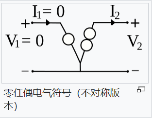 零任偶(nullor)是一種理想的二端口網(wǎng)絡(luò),輸入端為零極子,輸出端為任意子,零任偶類(lèi)似一個(gè)理想的放大器,其電壓增益、電流增益、跨導(dǎo)增益和跨阻抗(transimpedance)增益都是無(wú)限大。其傳輸參數(shù)都為0,也就是說(shuō),其輸入-輸出關(guān)系可以用以下的矩陣方程式表示。