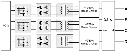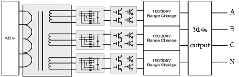 | 特點: ·一個輸出變壓器三組繞組,一組變流器, IGBT 使用數量僅 6 個·僅能供三相負載使用 ( 無法各相單獨取用 ) ,不適合三相不平衡負載 ·此結構僅能制作于一機箱 |