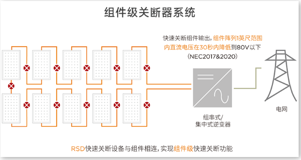 組件級(jí)關(guān)斷器是一種可實(shí)現(xiàn)組件級(jí)別的快速關(guān)斷的裝置,在危急情況下,可以遠(yuǎn)程或者手動(dòng)快速關(guān)斷每一塊光伏組件之間的連接,斷開(kāi)后系統(tǒng)電壓等于組件開(kāi)路電壓,消除“電擊風(fēng)險(xiǎn)”。