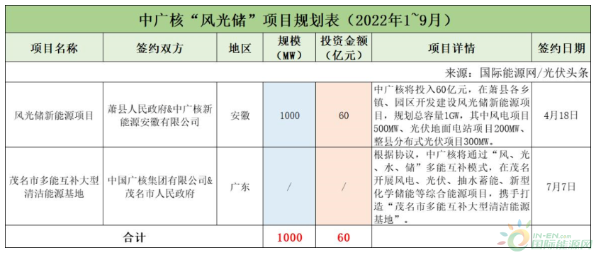 截至2022年9月30日,中廣核共簽約(規(guī)劃)2個(gè)風(fēng)光儲(chǔ)項(xiàng)目,其中已明確項(xiàng)目規(guī)模為1GW,有1個(gè)項(xiàng)目明確投資金額60億元。