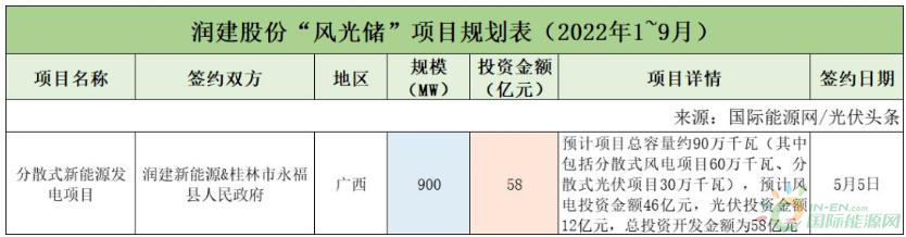 截至2022年9月30日,中國(guó)能建共簽約(規(guī)劃)10個(gè)風(fēng)光儲(chǔ)項(xiàng)目,明確項(xiàng)目規(guī)模共計(jì)19.94GW。此外,有7個(gè)項(xiàng)目明確投資金額,共926億元。