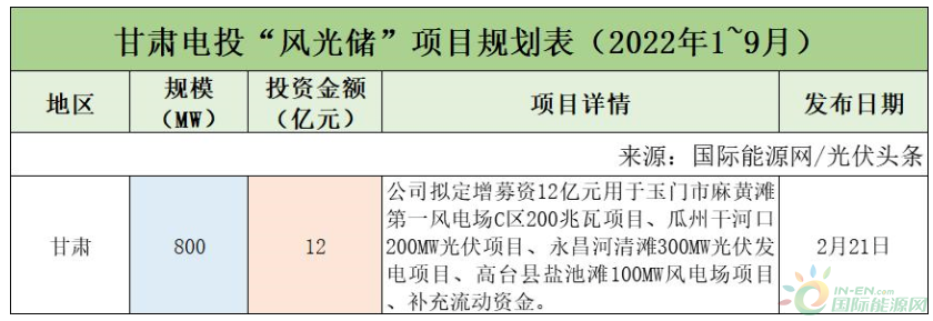截至2022年9月30日,甘肅電投共規(guī)劃1個(gè)風(fēng)光儲(chǔ)項(xiàng)目,項(xiàng)目規(guī)模為800MW,投資金額12億元。