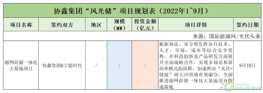 截至2022年9月30日,協(xié)鑫集團(tuán)共簽約(規(guī)劃)1個(gè)風(fēng)光儲(chǔ)項(xiàng)目,該項(xiàng)目?jī)H簽署了合作協(xié)議。