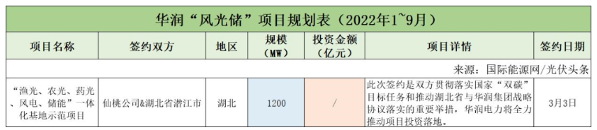 截至2022年9月30日,華潤(rùn)共簽約(規(guī)劃)1個(gè)風(fēng)光儲(chǔ)項(xiàng)目,項(xiàng)目規(guī)模1.2GW。