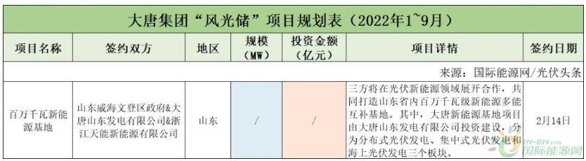 截至2022年9月30日,大唐集團(tuán)共簽約(規(guī)劃)1個(gè)風(fēng)光儲(chǔ)項(xiàng)目,該項(xiàng)目只簽署了合作協(xié)議。