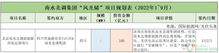 截至2022年9月30日,南水北調(diào)集團(tuán)共簽約(規(guī)劃)1個(gè)風(fēng)光儲(chǔ)項(xiàng)目,投資金額為100億元。