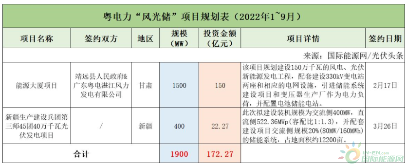 截至2022年9月30日,粵電力共簽約(規(guī)劃)2個(gè)風(fēng)光儲(chǔ)項(xiàng)目,明確規(guī)模共計(jì)1.9GW,明確投資金額共計(jì)172.27億元。