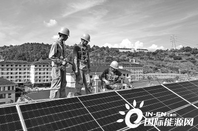 圖為國網(wǎng)嵊州市供電公司工作人員在嵊州市高級(jí)中學(xué)屋頂安裝輕質(zhì)柔性太陽能光伏板。